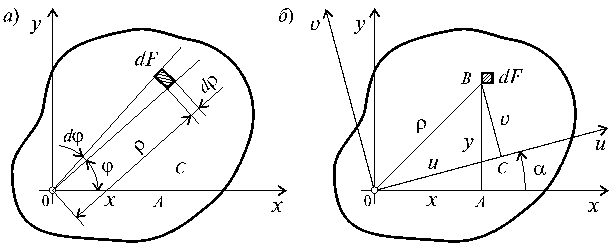 - Для плоского сечения F оси x, y являются