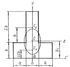 1. Разбиваем изображенную на рис. 4.4 фигуру на простые и присваиваем им номера 1 и 2. Центры тяжести каждой из простых фигур обозначаем соответственно с1 и с2.