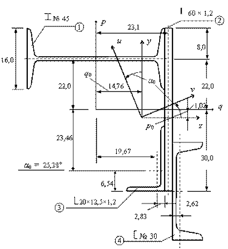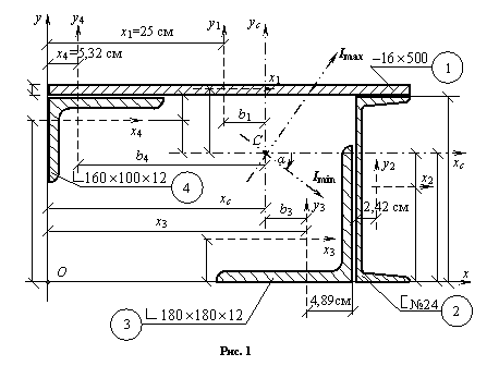 Найти положение главных центральных осей инерции и значение главных моментов инерции для сечения состоящего из равнобокого уголка и двутавра (см. рис.1). Вычертить сечение в масштабе 1:2 и указать на нём все размеры в числах и все оси, если дано: уголок 90х7, двутавр №22.