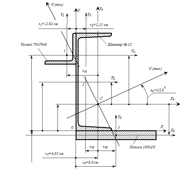 Для этого следует начертить профиль составного сечения в масштабе 1:2, провести координатные оси .
