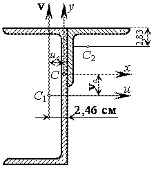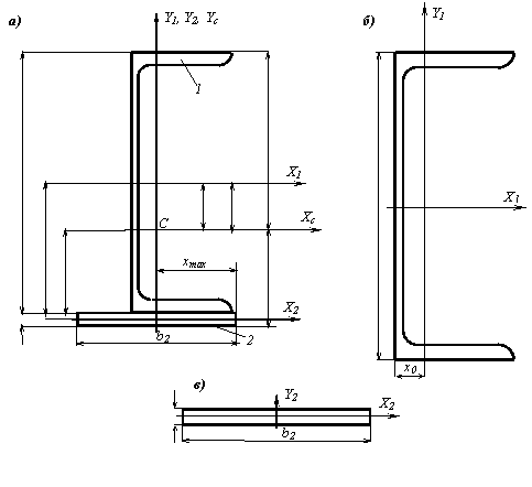 1. Проводим вспомогательную систему осей координат (Х, Y). Начало координат целесообразно расположить в центре тяжести какой-либо из фигур, например двутавра (чтобы сократить объём вычислений). Определяем координаты центра тяжести С всей фигуры в системе осей Х и Y: