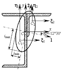 5. Определить величины главных центральных моментов инерции сечения и проверить правильность их вычисления. Величины главных центральных моментов инерции составного сечения вычисляем по формуле: