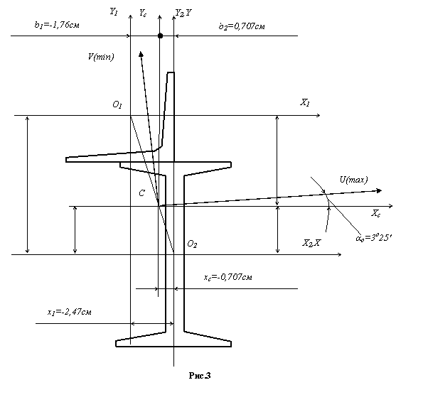 Через центр тяжести С (рисунок 3) проводим центральные оси ХС и YC параллельно проведённым ранее собственным осям уголка и двутавра (Х1, Y1, Х2, Y2).