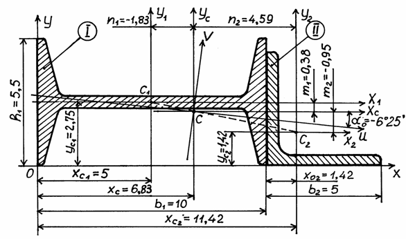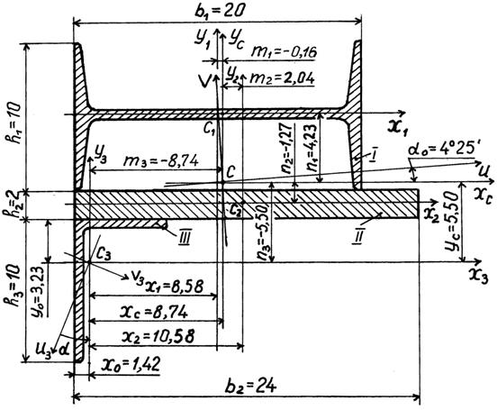 В системе координат центральных осей ХС и YC координаты центров тяжести уголка и двутавра определяем из выражений