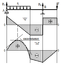 При построении эпюр Q и М договоримся на эпюре Q положительные значения откладывать сверху нулевой линии. На эпюре М у строителей принято откладывать положительные ординаты снизу. Такое правило построения эпюры М называется построением эпюры со стороны растянутых волокон, т. е. положительные значения М откладываются в сторону выпуклости изогнутой балки.