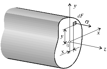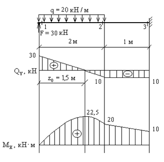 Как было сказано выше, при плоском поперечном изгибе в балке возникают два внутренних усилия: поперечная сила Q и изгибающий момент M. В соответствии с методом сечений поперечную силу можно найти как сумму проекций всех внешних сил, взятых с одной стороны от сечения, на ось, перпендикулярную оси стержня (ось z). Изгибающий момент равен сумме моментов всех внешних сил, взятых с одной стороны от сечения, относительно оси, проходящей через центр тяжести рассматриваемого сечения (оси y).