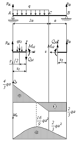 Последовательно на каждом участке вводится скользящая система координатных осей (начало координат совмещается с началом участка) и для произвольного сечения составляются выражения для определения поперечной силы и изгибающего момента. Затем по этим выражениям в пределах каждого участка строятся графики (эпюры) внутренних сил.
