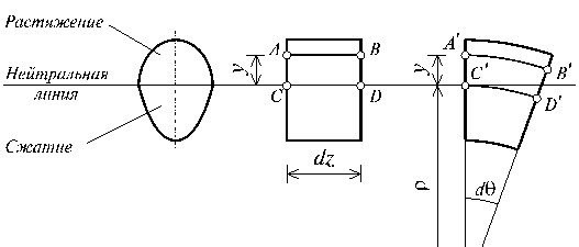 Достаточно очевидно и подтверждается опытом, что балка при изгибе деформируется таким образом, что волокна, расположенные в выпуклой части, растягиваются, а в вогнутой – сжимаются. Между ними лежит слой волокон, который лишь искривляется, не изменяя своей первоначальной длины (рис.6.8). Этот слой называется нейтральным или нулевым, а его след на плоскости поперечного сечения – нейтральной (нулевой) линией или осью.