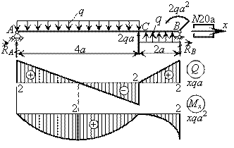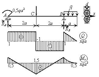 Строим эпюры q и М и находим расчетный изгибающий момент, равный Мmax = 1,5 qa2.