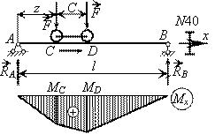 Тележка перемещается вдоль балки длиной l = 10 м. На каждое колесо действует нагрузка F = 20 кН. Найти опасное положение тележки, при котором изгибающий момент будет иметь наибольшее значение и определить наибольшее напряжение, полагая С = 2 м.