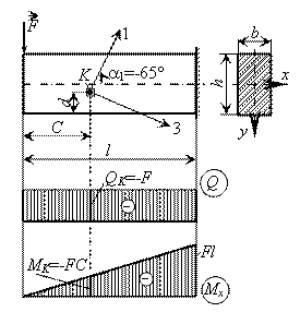 Определить главные напряжения в точке К консольной балки (рис.1), нагруженной сосредоточенной силой F = 50 кН, приложенной на свободном конце, если l = 50 см, С = 20, d = 4 см, b = 4 см, h = 10 см.