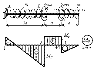 На участке CD момент изменяется по линейному закону от нуля в точке D до MCD = -ma. В сечении С крутящий момент изменяется скачком на величину внешнего момента Мс, равного 2ma (скачок вверх, так как момент МС направлен против часовой стрелки). На участке ВС крутящий момент сохраняет постоянное значение, так как отсутствует погонная нагрузка (m = 0). Скручивающий момент МВ направлен по часовой стрелке, поэтому в сечении В на эпюре МК скачок происходит вниз и равен по величине МВ = 3ma. На участке АВ, нагруженном распределенной нагрузкой m, крутящий момент изменяется по линейному закону от МВА = -2ma до МАВ = МВА + m×3a = ma.
