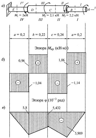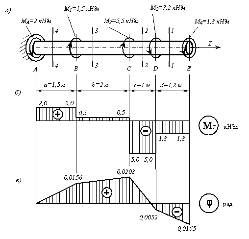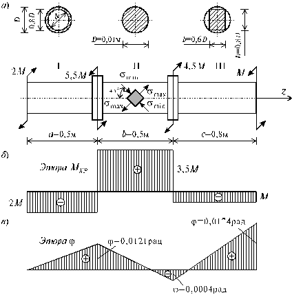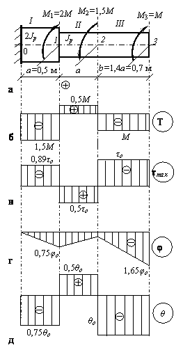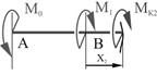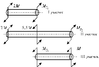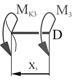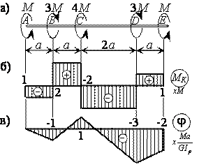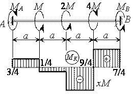 Эпюра МК. На вал не действует распределенная нагрузка (m = 0), поэтому эпюра МК состоит из отрезков прямых, параллельных оси абсцисс. В сечениях, где к валу приложены сосредоточенные скручивающие пары, на эпюре МК наблюдаются скачки, равные приложенным моментам. Вычисляем моменты по участкам МDE = М, МCD = МDE –3М = -2М, MBC = MCD + 4M = 2M, MAB = MBC –3M = -M и строим эпюру МК (рис. б).