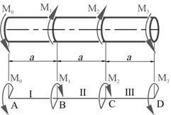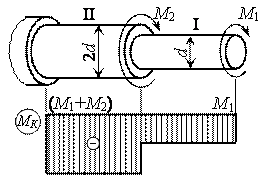 Считая величину момента М1 известной, определить при заданном соотношении диаметров ступенчатого вала величину момента М2 из условия равнопрочности тонкой и толстой частей.