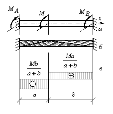 Построить эпюру крутящих моментов для вала постоянного по длине поперечного сечения, жестко защемленного обоими торцами и нагруженного скручивающим сосредоточенным моментом М (см. рис.), расположенным на расстоянии а от левого закрепления.