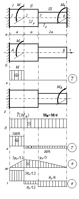 Из этого условия находим МВ = М/6. Крутящий момент МВ будет являться опорной реакцией для статически неопределимого стержня,