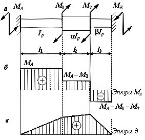 . Приложим к статически определимому стержню крутящий момент МВ (рис. г) и определим угол поворота