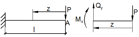 - Определить внутренние усилия и перемещения консольной балки прямоугольного сечения, нагруженной двумя силами P, модуль Юнга равен E. Размеры указаны на рисунке.
