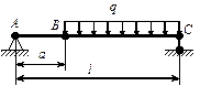 - К шарнирно опёртой разрезной балке ABC приложена распределённая нагрузка интенсивностью q. Считая известными размеры a и l, модуль Юнга E и момент инерции поперечного сечения J, определить внутренние усилия и перемещения балки с помощью метода Мора-Симпсона.