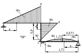. Найдем ординаты под центрами тяжести этих фигур на эпюре М1 (