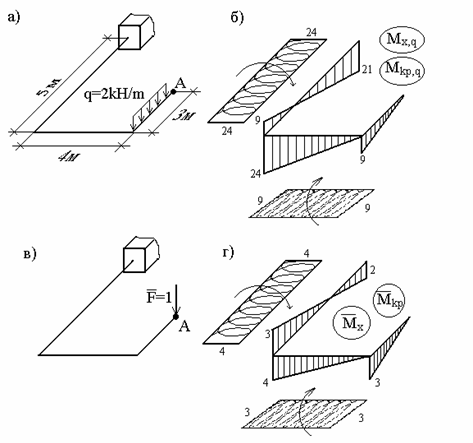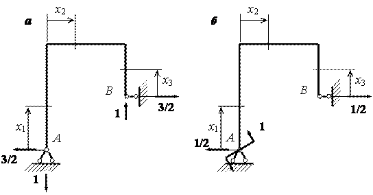 Аналогично для определения второго обобщенного перемещения – угла поворота сечения А – приложим в точке А сосредоточенную пару сил, равную единице (рис. б), и определим изгибающий момент от этой пары: