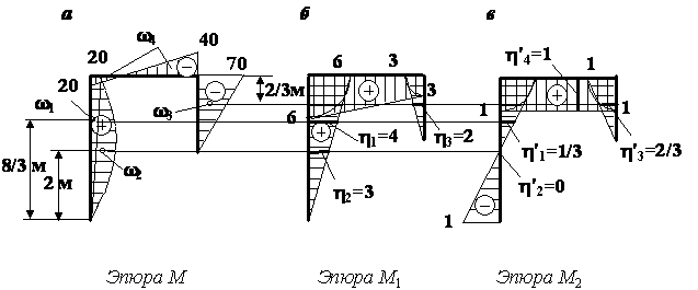 Построим эпюры моментов от заданной нагрузки М и от единичных обобщенных сил, соответствующих искомым перемещениям, М1 и М2 (рис. 3).