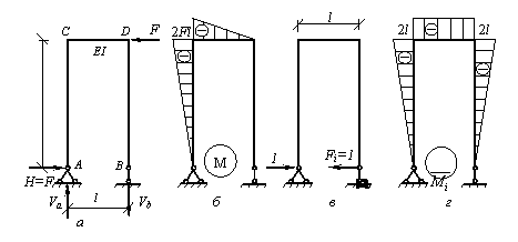 Определить горизонтальное смещение опорной точки В ломаного стержня (рамы), изображенного на рис. а. Жесткость на изгиб всех участков рамы постоянна и равна EI.