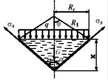 Отсечем часть сферической оболочки нормальным коническим сечением с углом 2φ при вершине и рассмотрим равновесие этой части оболочки вместе с заключенной в ней жидкостью с удельным весом γ. Сферическую часть отделим от основной оболочки плоскостью, перпендикулярной оси симметрии.