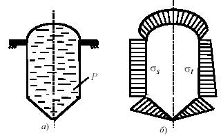 Для случая наполнения резервуара жидкостью необходимо учитывать, что если на какую-либо поверхность действует давление жидкости, то вертикальные составляющие сил давления равны весу жидкости в объеме, расположенном над поверхностью. Поэтому давление жидкости в различных сечениях оболочки будет различным, в отличие от давления газа.