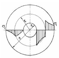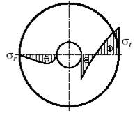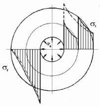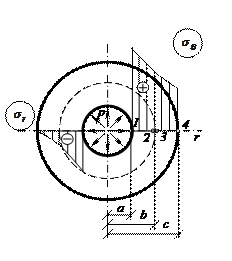 Эпюра распределения напряжений по толщине сплошной трубы с внутренним радиусом a и внешним радиусом c показана на рис. 2.