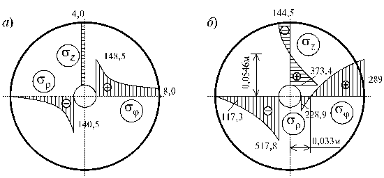 Эпюры напряжений σp, σφ, σz для упругого состояния материала трубы приведены на рис. 1, а.