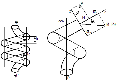 Приведём, направленную по оси пружины силу Р к центру тяжести сечения. В результате получим вектор-момент