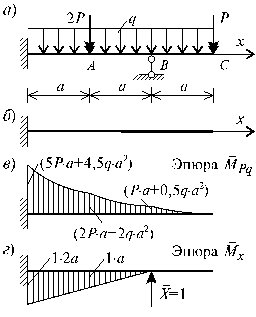 Основная система изображена на рис.18.7, б. Эпюра моментов в основной системе от заданной системы внешних сил и единичной вертикальной силы X = 1, приложенной в месте и по направлению, отображенной связи показана на рис.18.7, в, г.