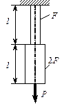 - Вертикально расположенный ступенчатый брус нагружен на свободном конце растягивающей силой P. Найти распределение продольной силы, нормального напряжения и осевого перемещения по длине бруса. Заданы площадь F, длина l, удельный вес γ, модуль Юнга E.