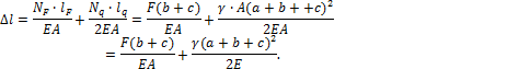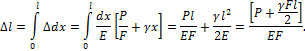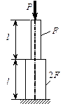 - Вертикально расположенный ступенчатый брус нагружен на свободном конце сжимающей силой P. Найти распределение продольной силы, нормального напряжения и осевого перемещения по длине бруса. Известны площадь F, длина l, удельный вес γ, модуль Юнга E.