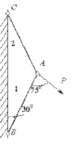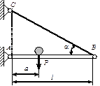 - Консольный кран несёт нагрузку P. Определить внутренние усилия и перемещения балки AB, считая тягу BC нерастяжимой. Принять для балки AB площадь и момент инерции поперечного сечения равными F, I; модуль Юнга – E. Геометрические размеры указаны на рисунке.