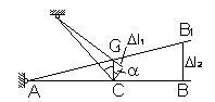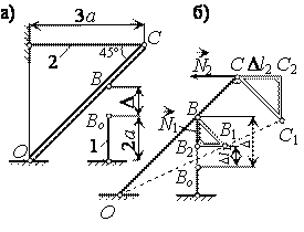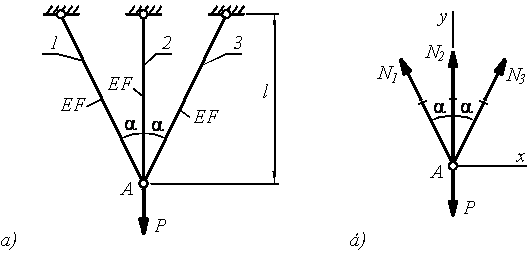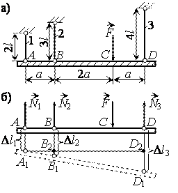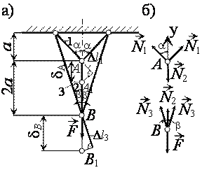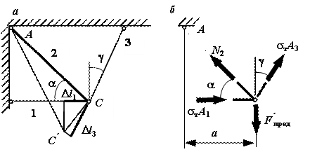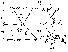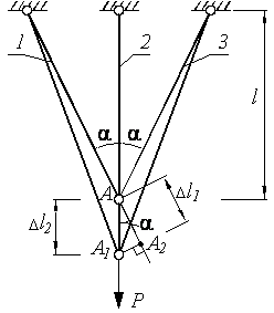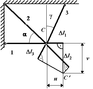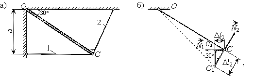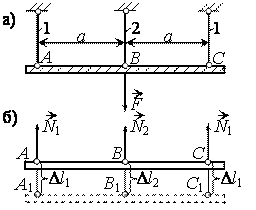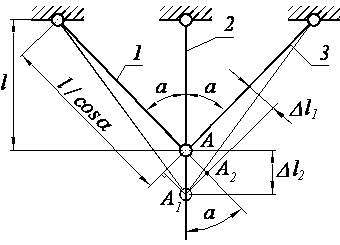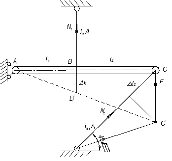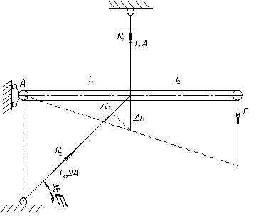 Для составления дополнительных уравнений рассмотрим деформированное состояние системы (рис. 1, в), имея в виду, что брус абсолютно жесткий и поэтому после деформации тяг останется прямолинейным.