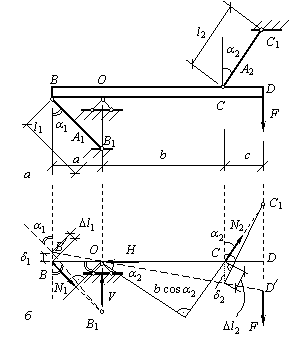 которое содержит две неизвестные нормальные силы N1 и N2. Для составления дополнительного уравнения перемещений рассмотрим деформацию системы, предположив, что абсолютно жесткий брус ВD при деформации повернется вокруг опоры О (рис. б, пунктирная линия В/ОD/), оставаясь прямым.