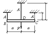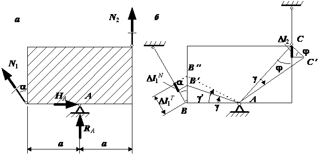 приложенная к абсолютно жесткому брусу ВD. Таким образом, имеем четыре неизвестные реакции (N1, N2, V, H,) и три уравнения равновесия (