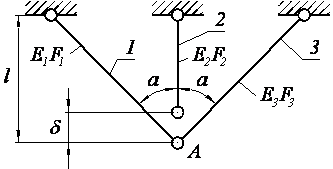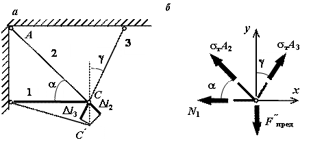 Из уравнений равновесия видно, что система дважды статически неопределима, т.к. два уравнения равновесия (2) и (3) содержат в своем составе четыре неизвестных. Поэтому для решения задачи необходимо составить два дополнительных уравнения совместности деформаций, раскрывающих статическую неопределимость системы.
