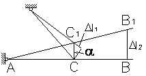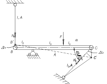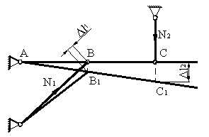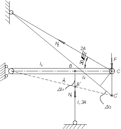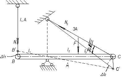 Из-за малости перемещений будем полагать, что точки В, С, D при деформации системы переместятся соответственно в точки В/, С/, D/, т.е. перемещения точек абсолютно жесткого бруса будут происходить вертикально. Определим удлинения стержней ВВ1 и СС1: