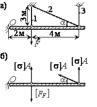 2. Определить в процессе увеличения нагрузки Р такую ее величину, при которой напряжение в одной из тяг достигнет предела текучести. Для вычисления величины Р, при которой напряжение в одной из тяг достигнет предела текучести sT , определим нормальные напряжения, возникающие в тягах, учитывая то, что тяги работают на растяжение: