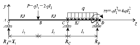 Для определения опорных реакций RA, RB, RC составим уравнения равновесия: