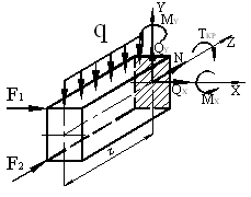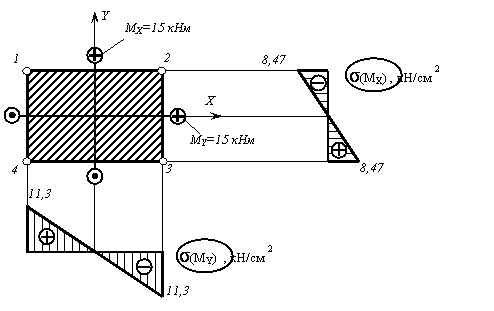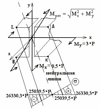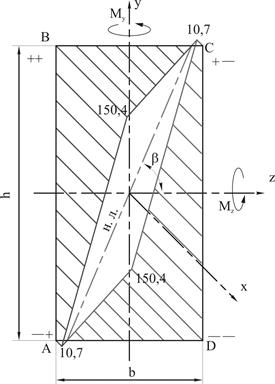 При этом момент Mz растягивает верхние волокна и сжимает нижние, а момент My растягивает левые волокна и сжимает правые.