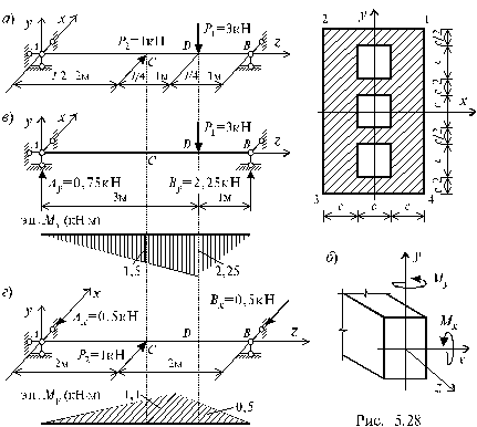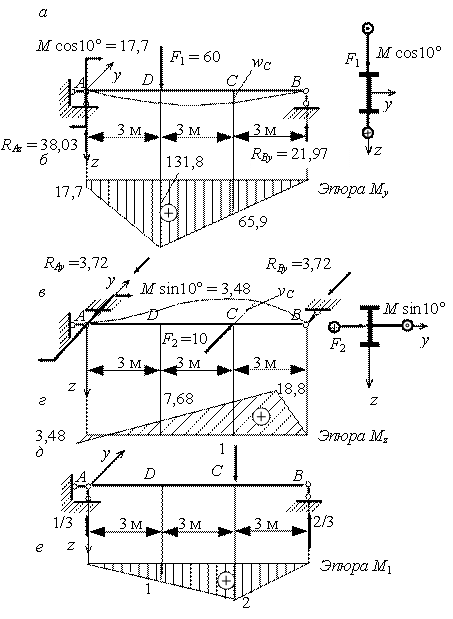 Разложив силу на две составляющие по главным осям сечения балки, определим опорные реакции, действующие в главных плоскостях, и построим эпюры изгибающих моментов Mz и My, рис. 2, а.
