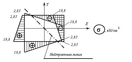 Продлим нейтральную линию и на перпендикуляре построим эпюру напряжений.
