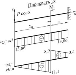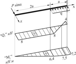 Разложим нагрузку на вертикальную (рис. 2, а) и горизонтальную (рис. 2, в) составляющие и построим эпюры