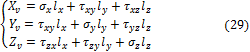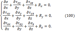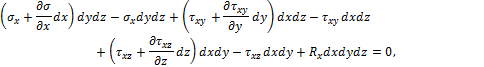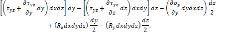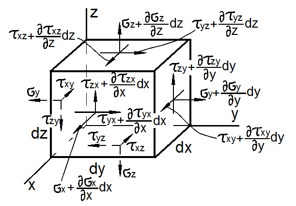 и называют тензором напряжений Коши. Система напряжений, приложенных к частице тела, должна удовлетворять условиям равновесия. Первые три условия в проекциях на оси x, y, z дают тождества, т.к. на противоположных гранях мы считаем напряжения равными по величине. Остаётся проверить, обращаются ли в нуль суммы моментов всех сил относительно координатных осей. Составим условие равновесия моментов относительно оси х: