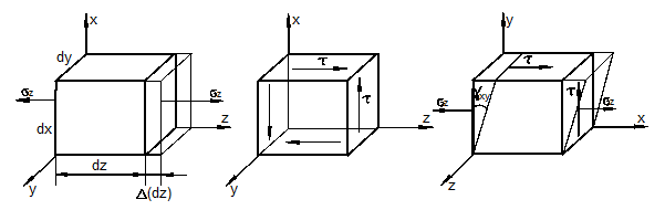 Отнесём тело к координатным осям x, y, z и выделим мысленно из него материальную частицу в виде параллелепипеда или кубика размерами dx, dy, dz (рис. 3.1).
