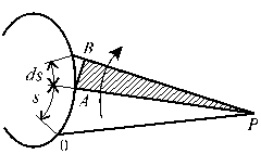 Рассмотрим срединную линию контура поперечного сечения (рис.19.3). Срединная линия - это геометрическое место точек поперечного сечения, равноудаленно расположенных от контурных линий. Выберем на срединной линии начало 0 отсчета дуги s и из заданного полюса Р. Проведем два луча к концам элементарного отрезка ds. Удвоенную площадь треугольника PAB обозначают через dω.